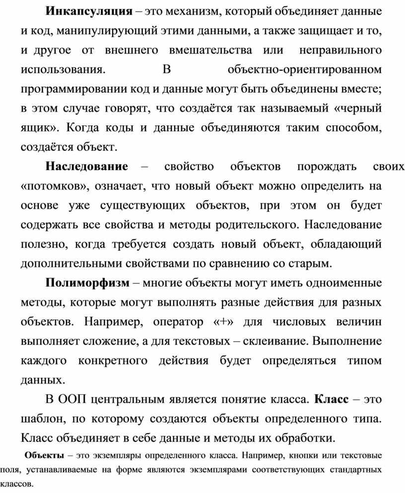 Полиморфизм – многие объекты могут иметь одноименные методы, которые могут выполнять разные действия для разных объектов. Например, оператор «+» для числовых величин выполняет сложение, а для текстовых – склеивание. Выполнение каждого конкретного действия будет определяться типом данных.