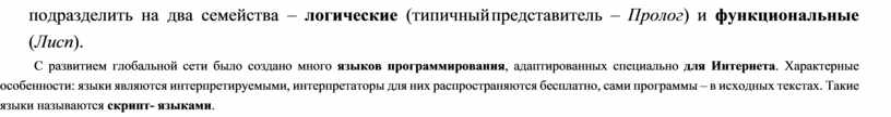 С развитием глобальной сети было создано много языков программирования, адаптированных специально для Интернета. Характерные особенности: языки являются интерпретируемыми, интерпретаторы для них распространяются бесплатно, сами программы – в исходных текстах. Такие языки называются скрипт- языками.