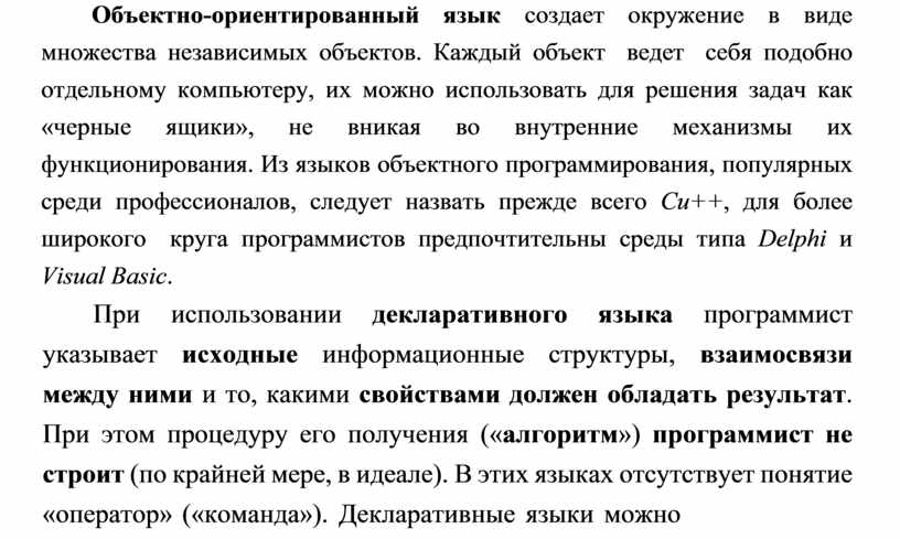 Объектно-ориентированный язык создает окружение в виде множества независимых объектов. Каждый объект ведет себя подобно отдельному компьютеру, их можно использовать для решения задач как «черные ящики», не вникая во внутренние механизмы их функционирования. Из языков объектного программирования, популярных среди профессионалов, следует назвать прежде всего Си++, для более широкого круга программистов предпочтительны среды типа Delphi и Visual Basic.