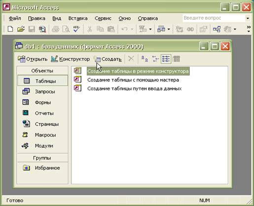 Исходное окно MS Access отличается простотой и лаконичностью. Шесть вкладок этого окна представляют шесть видов объектов, с которыми работает программа.