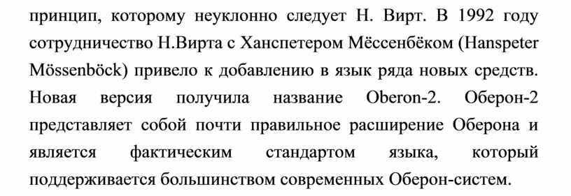 принцип, которому неуклонно следует Н. Вирт. В 1992 году сотрудничество Н.Вирта с Ханспетером Мёссенбёком (Hanspeter Mössenböck) привело к добавлению в язык ряда новых средств. Новая версия получила название Оberon-2. Оберон-2 представляет собой почти правильное расширение Оберона и является фактическим стандартом языка, который поддерживается большинством современных Оберон-систем.