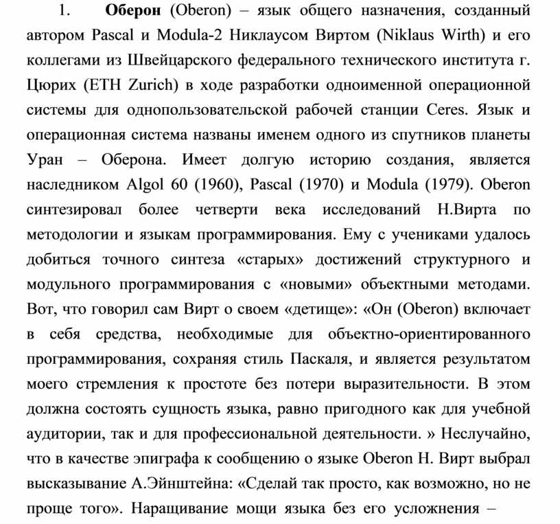 1. Оберон (Oberon) – язык общего назначения, созданный автором Pascal и Modula-2 Никлаусом Виртом (Niklaus Wirth) и его коллегами из Швейцарского федерального технического института г. Цюрих (ETH Zurich) в ходе разработки одноименной операционной системы для однопользовательской рабочей станции Ceres. Язык и операционная система названы именем одного из спутников планеты Уран – Оберона. Имеет долгую историю создания, является наследником Algol 60 (1960), Pascal (1970) и Modula (1979). Oberon синтезировал более четверти века исследований Н.Вирта по методологии и языкам программирования. Ему с учениками удалось добиться точного синтеза «старых» достижений структурного и модульного программирования с «новыми» объектными методами. Вот, что говорил сам Вирт о своем «детище»: «Он (Оberon) включает в себя средства, необходимые для объектно-ориентированного программирования, сохраняя стиль Паскаля, и является результатом моего стремления к простоте без потери выразительности. В этом должна состоять сущность языка, равно пригодного как для учебной аудитории, так и для профессиональной деятельности. » Неслучайно, что в качестве эпиграфа к сообщению о языке Oberon Н. Вирт выбрал высказывание А.Эйнштейна: «Сделай так просто, как возможно, но не проще того». Наращивание мощи языка без его усложнения –