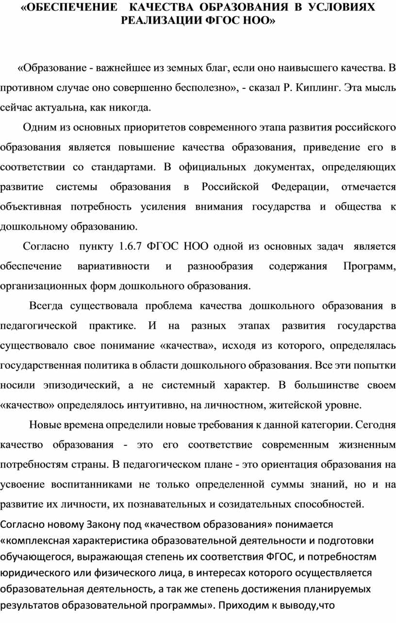 Новые времена определили новые требования к данной категории. Сегодня качество образования - это его соответствие современным жизненным потребностям страны. В педагогическом плане - это ориентация образования на усвоение воспитанниками не только определенной суммы знаний, но и на развитие их личности, их познавательных и созидательных способностей.