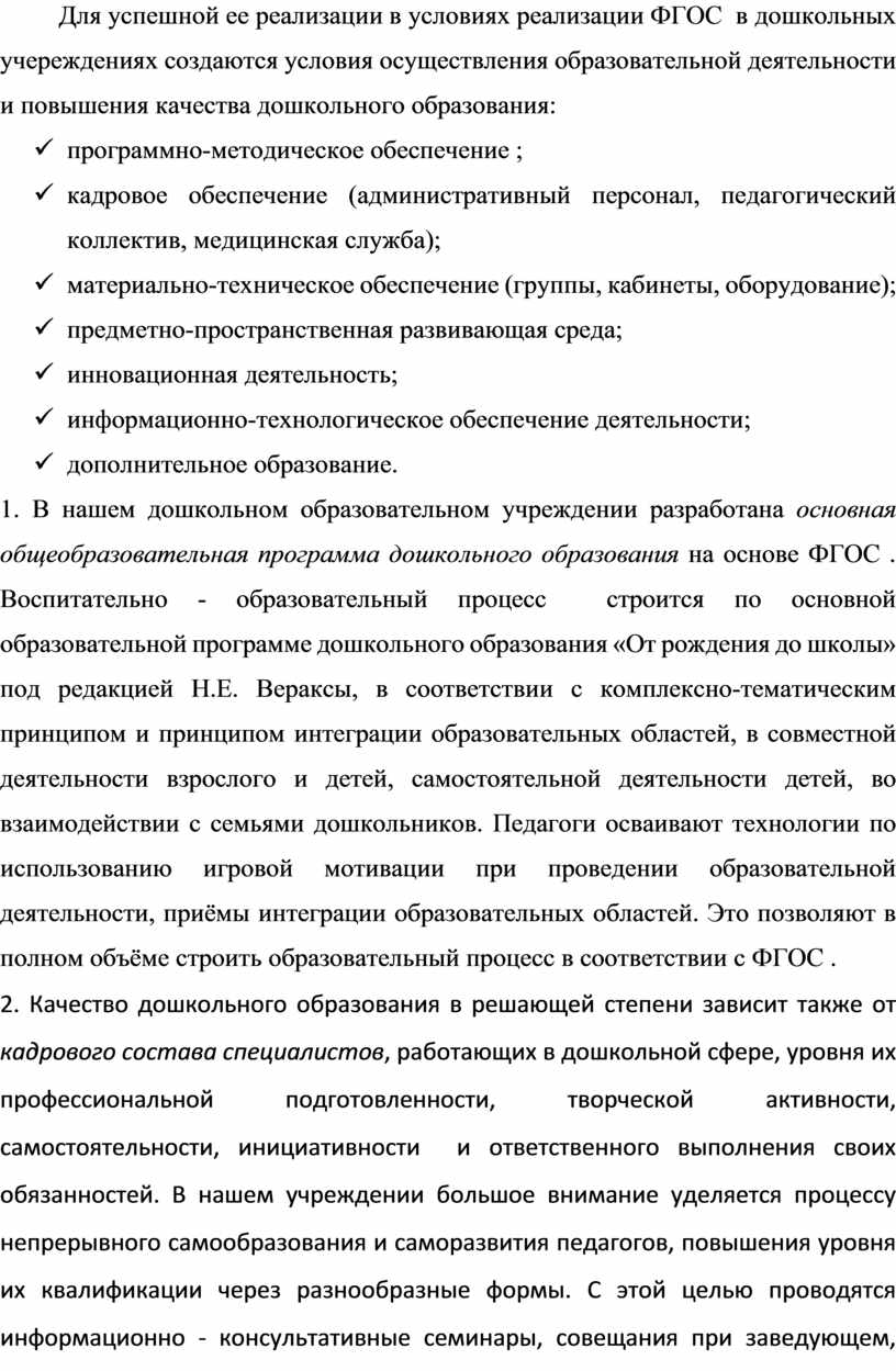 1. В нашем дошкольном образовательном учреждении разработана основная общеобразовательная программа дошкольного образования на основе ФГОС . Воспитательно - образовательный процесс строится по основной образовательной программе дошкольного образования «От рождения до школы» под редакцией Н.Е. Вераксы, в соответствии с комплексно-тематическим принципом и принципом интеграции образовательных областей, в совместной деятельности взрослого и детей, самостоятельной деятельности детей, во взаимодействии с семьями дошкольников. Педагоги осваивают технологии по использованию игровой мотивации при проведении образовательной деятельности, приёмы интеграции образовательных областей. Это позволяют в полном объёме строить образовательный процесс в соответствии с ФГОС .