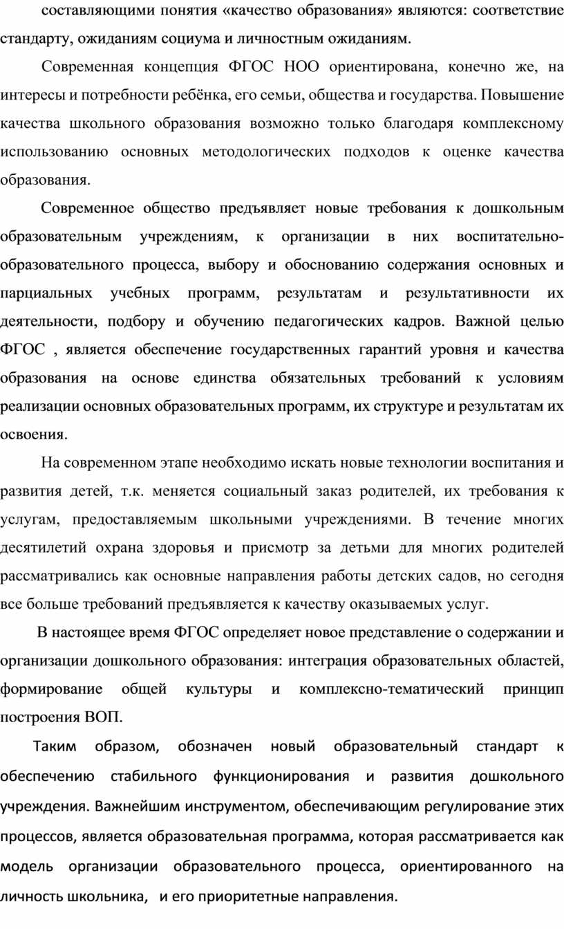 Одним из основных приоритетов современного этапа развития российского образования является повышение качества образования, приведение его в соответствии со стандартами. В официальных документах, определяющих развитие системы образования в Российской Федерации, отмечается объективная потребность усиления внимания государства и общества к дошкольному образованию.