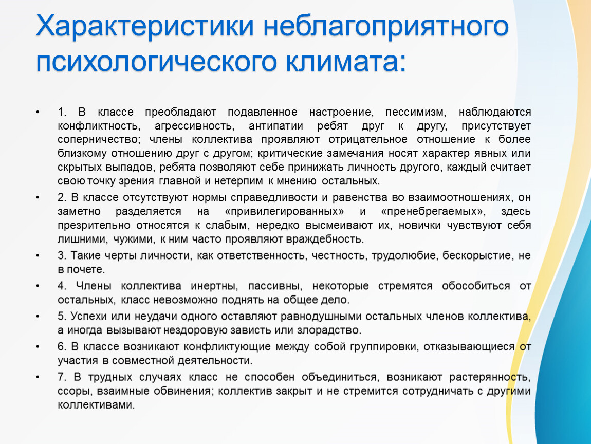 Благоприятный климат - это такой, который положительно влияет на самочувствие коллектива и определяет общий эмоциональный настрой на деятельность. Психологический климат не является изначально заданным, он формируется в ходе воспитания.