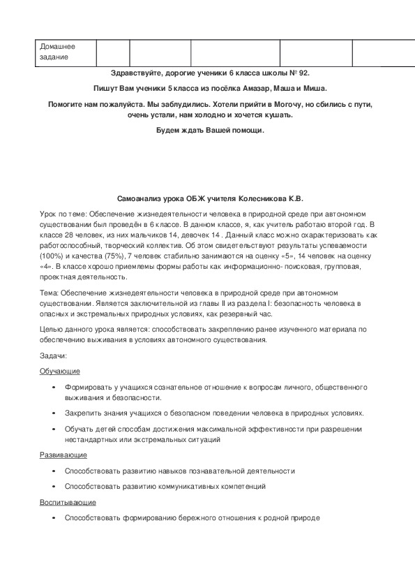 Самоанализ урока ОБЖ учителя Колесникова К.В.