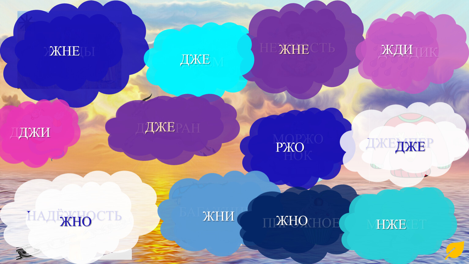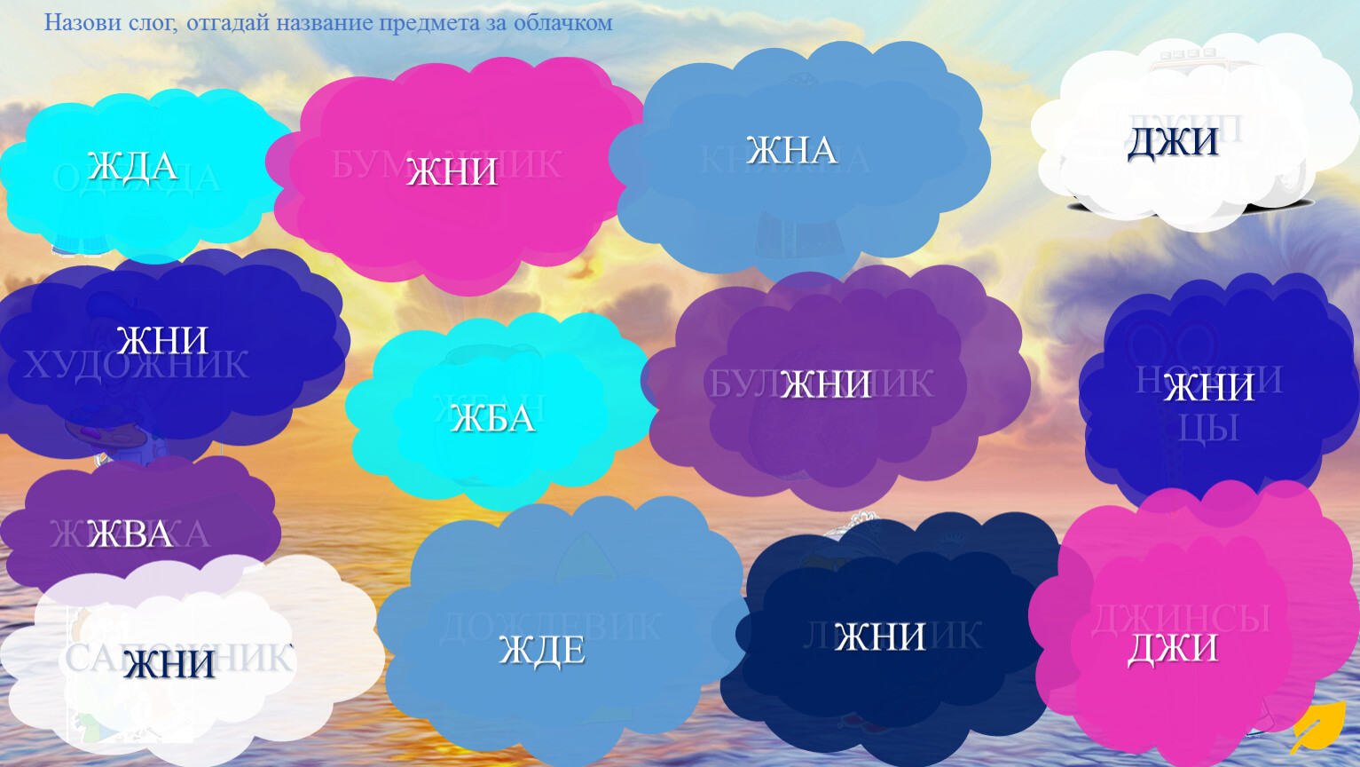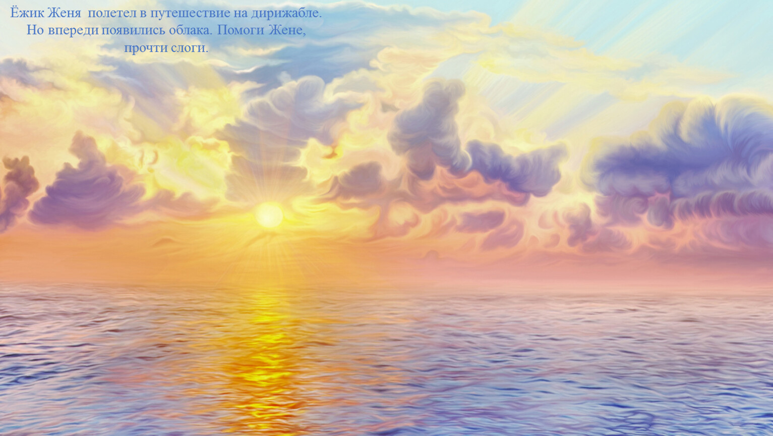 Ёжик Женя полетел в путешествие на дирижабле. Но впереди появились облака. Помоги Жене, прочти слоги.