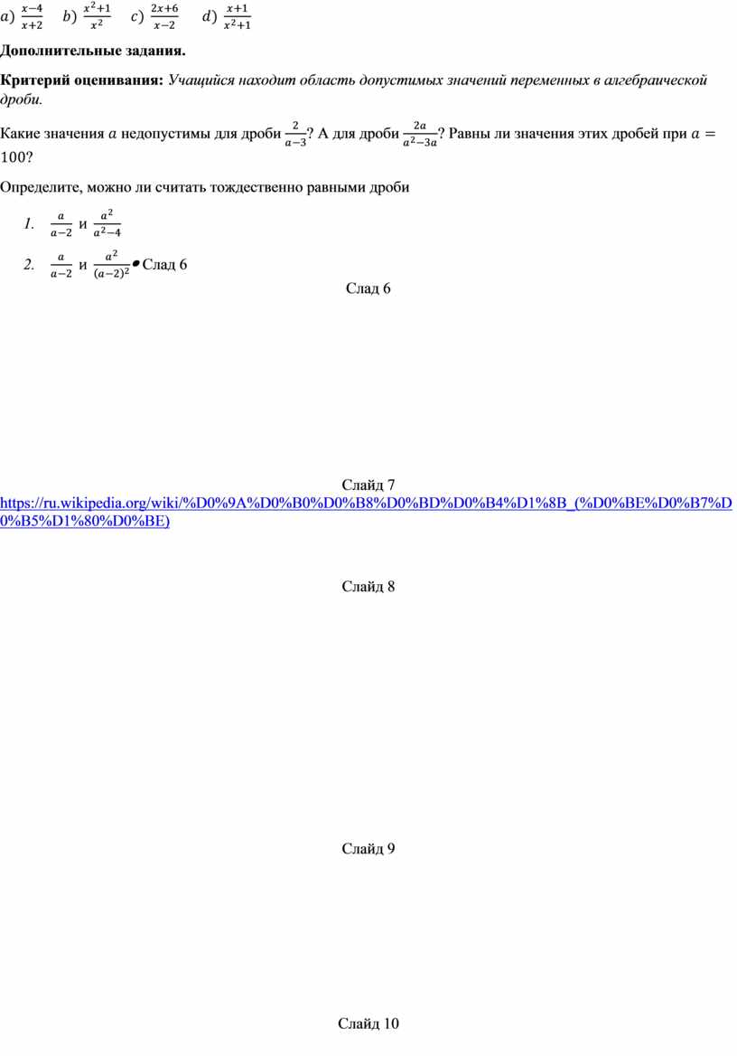 Дополнительные задания. Критерий оценивания: Учащийся находит область допустимых значений переменных в алгебраической дроби. Какие значения Определите, можно ли считать тождественно равными дроби |