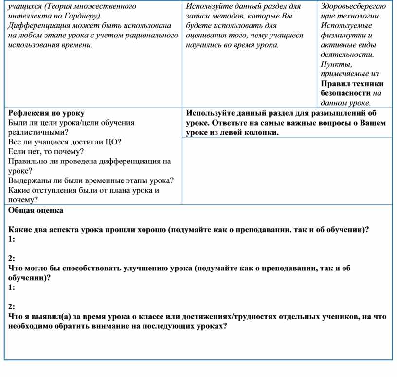Используйте данный раздел для размышлений об уроке. Ответьте на самые важные вопросы о Вашем уроке из левой колонки. |