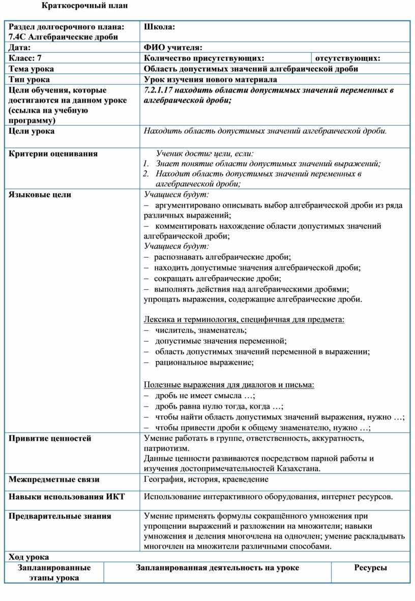 7.2.1.17 находить области допустимых значений переменных в алгебраической дроби; |