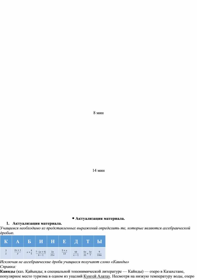 Исключая не алгебраические дроби учащиеся получают слово «Каинды» Справка: Каинды (каз. Қайыңды; в специальной топонимической литературе — Кайнды) — озеро в Казахстане, популярное место туризма в одном из ущелий Кунгей Алатау. Несмотря на низкую температуру воды, озеро Каинды пользуется успехом у любителей дайвинга. Главная достопримечательность озера — это ели, поднимающиеся прямо из воды. Озеро часто называется "мертвым" - в нем не водится рыба. Максимальная глубина водоема на 2014 г. - 21 метр.