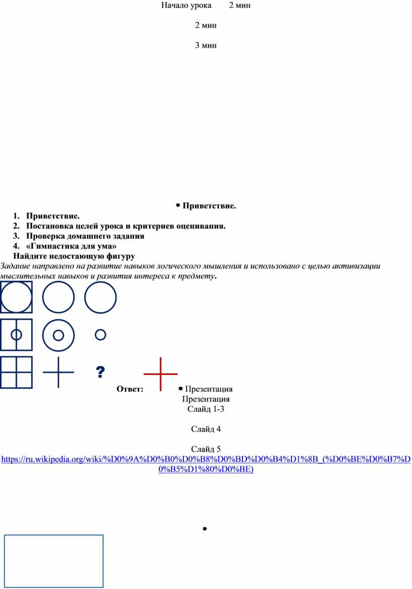 1. Приветствие. 2. Постановка целей урока и критериев оценивания. 3. Проверка домашнего задания 4. «Гимнастика для ума» Найдите недостающую фигуру Задание направлено на развитие навыков логического мышления и использовано с целью активизации мыслительных навыков и развития интереса к предмету.
