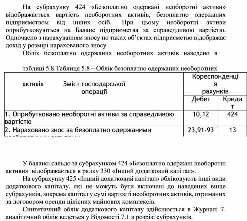 На субрахунку 424 «Безоплатно одержані необоротні активи» відображається вартість необоротних активів, безоплатно одержаних підприємством від інших осіб. При цьому необоротні активи оприбутковуються на Баланс підприємства за справедливою вартістю. Одночасно з нарахуванням зносу по таких об’єктах підприємство відображає дохід у розмірі нарахованого зносу.