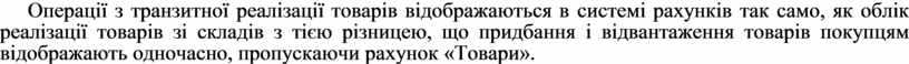Операції з транзитної реалізації товарів відображаються в системі рахунків так само, як облік реалізації товарів зі складів з тією різницею, що придбання і відвантаження товарів покупцям відображають одночасно, пропускаючи рахунок «Товари».