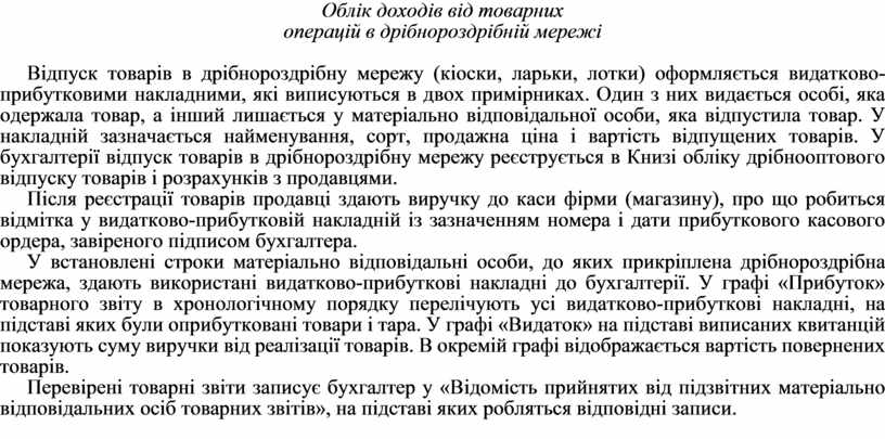 Відпуск товарів в дрібнороздрібну мережу (кіоски, ларьки, лотки) оформляється видатково-прибутковими накладними, які виписуються в двох примірниках. Один з них видається особі, яка одержала товар, а інший лишається у матеріально відповідальної особи, яка відпустила товар. У накладній зазначається найменування, сорт, продажна ціна і вартість відпущених товарів. У бухгалтерії відпуск товарів в дрібнороздрібну мережу реєструється в Книзі обліку дрібнооптового відпуску товарів і розрахунків з продавцями.