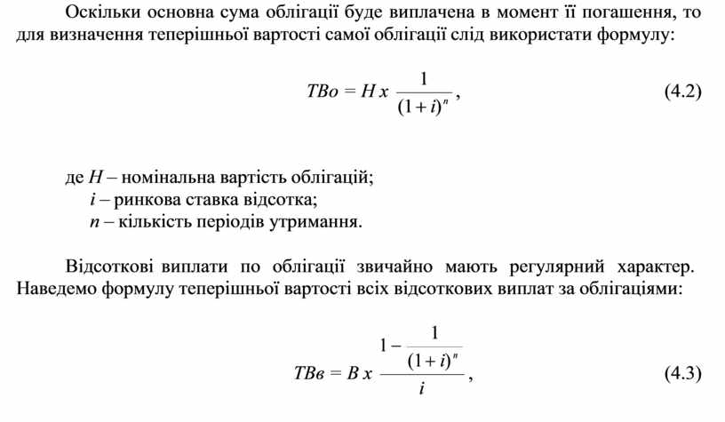 Оскільки основна сума облігації буде виплачена в момент її погашення, то для визначення теперішньої вартості самої облігації слід використати формулу: