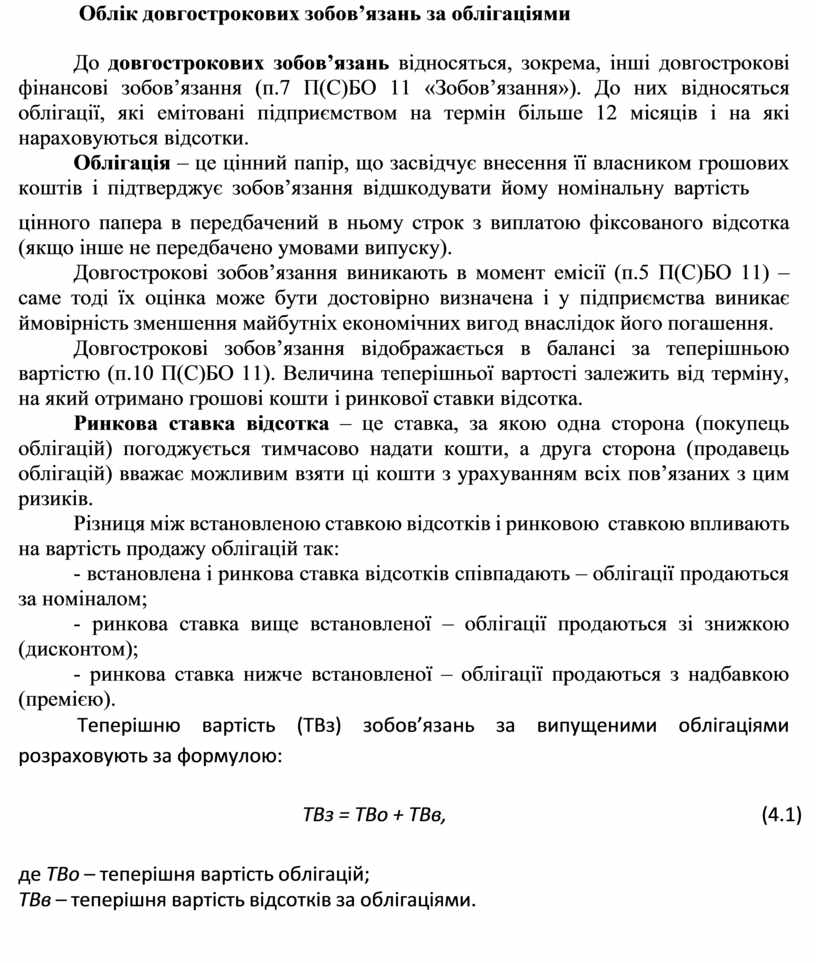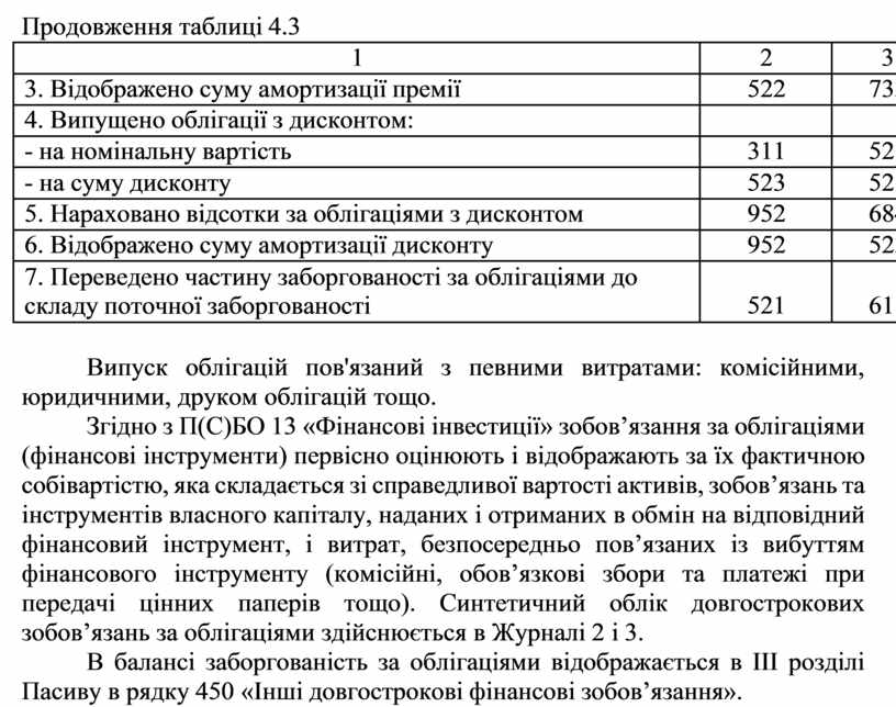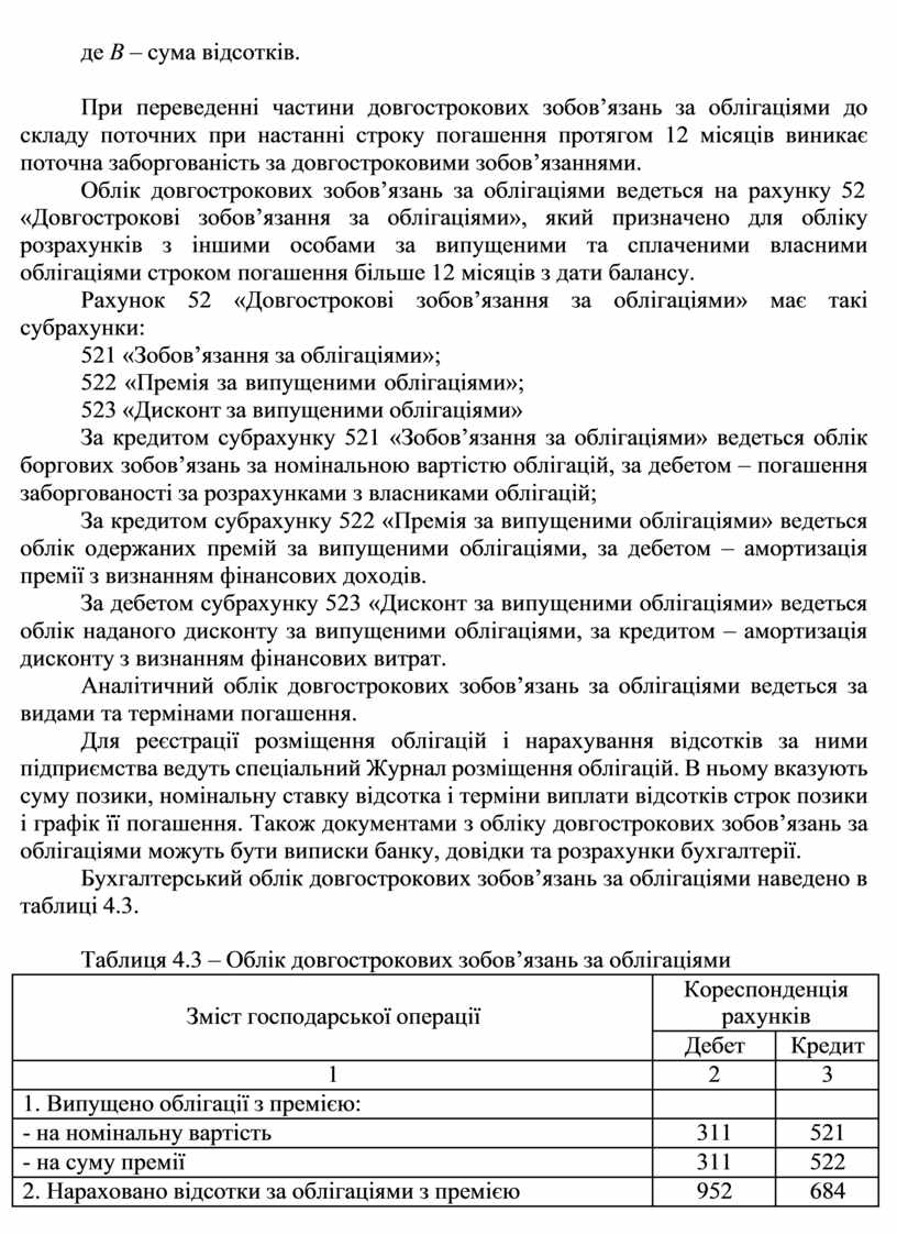 Бухгалтерський облік довгострокових зобов’язань за облігаціями наведено в таблиці 4.3.