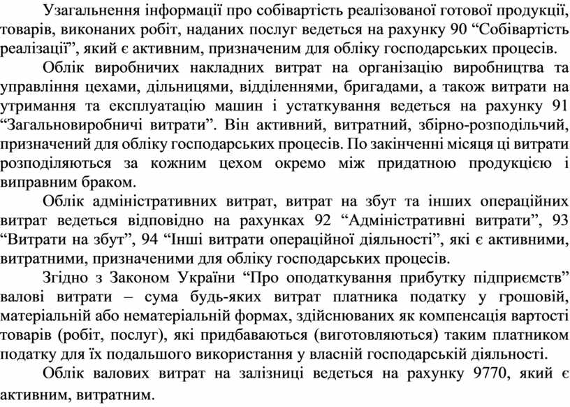 Узагальнення інформації про собівартість реалізованої готової продукції, товарів, виконаних робіт, наданих послуг ведеться на рахунку 90 “Собівартість реалізації”, який є активним, призначеним для обліку господарських процесів.