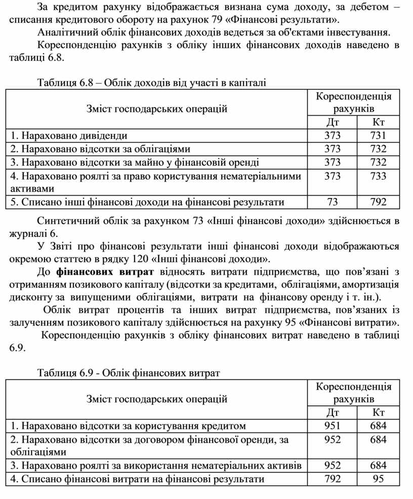 Кореспонденцію рахунків з обліку інших фінансових доходів наведено в таблиці 6.8.