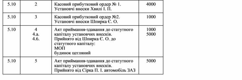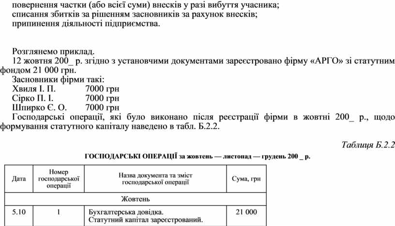 Господарські операції, які було виконано після реєстрації фірми в жовтні 200_ p., щодо формування статутного капіталу наведено в табл. Б.2.2.