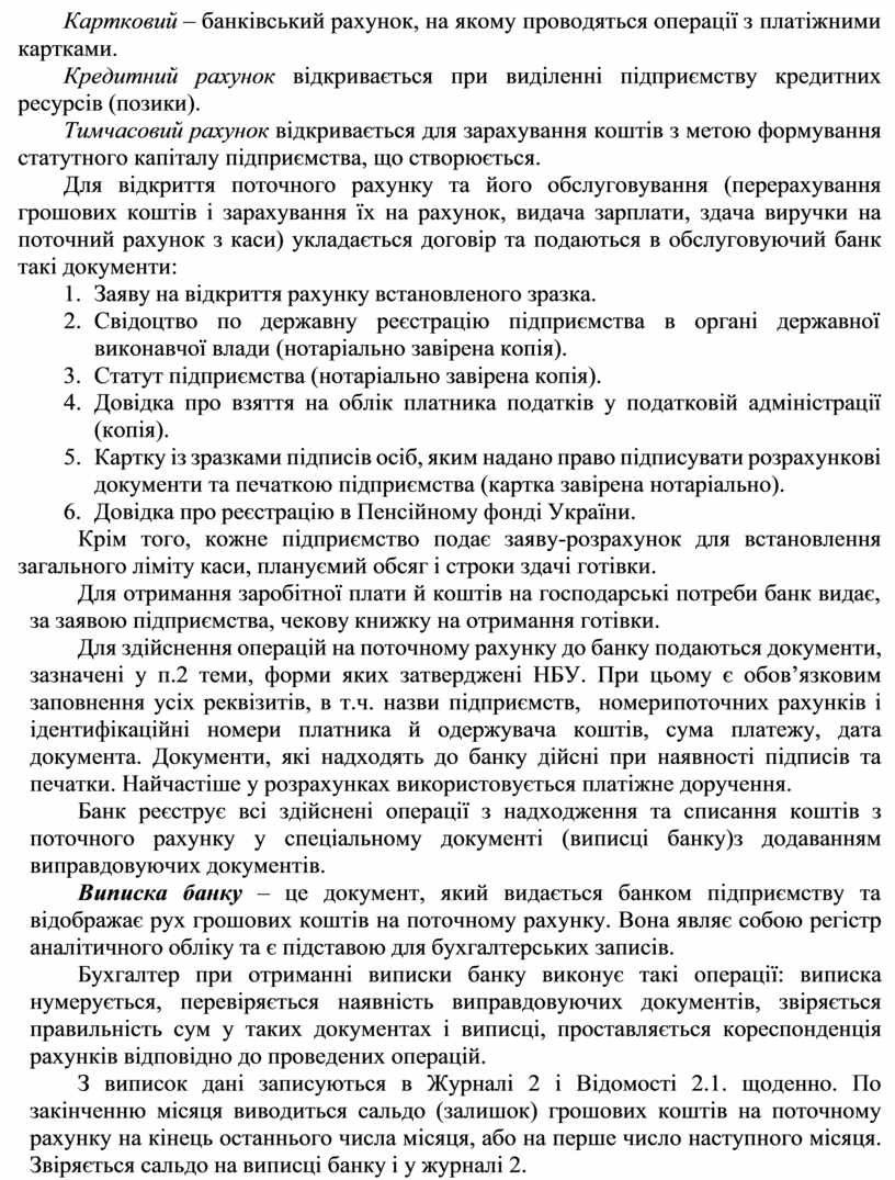 Для відкриття поточного рахунку та його обслуговування (перерахування грошових коштів і зарахування їх на рахунок, видача зарплати, здача виручки на поточний рахунок з каси) укладається договір та подаються в обслуговуючий банк такі документи: