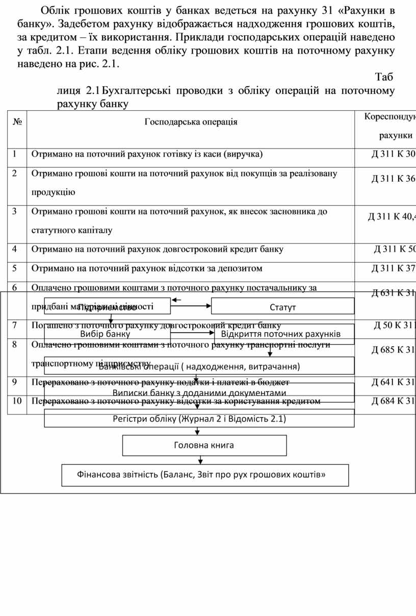 Облік грошових коштів у банках ведеться на рахунку 31 «Рахунки в банку». За дебетом рахунку відображається надходження грошових коштів, за кредитом – їх використання. Приклади господарських операцій наведено у табл. 2.1. Етапи ведення обліку грошових коштів на поточному рахунку наведено на рис. 2.1.