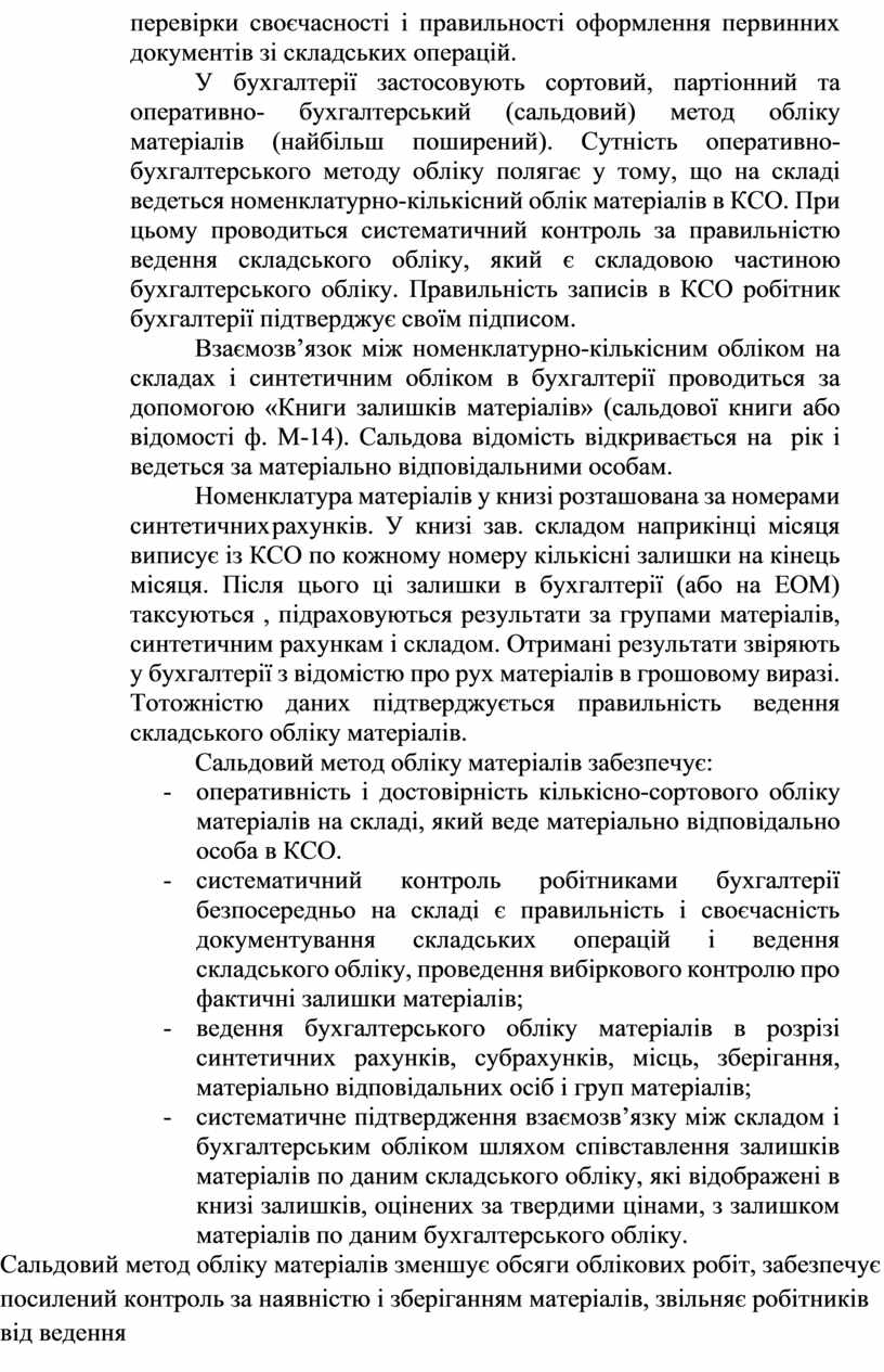 У бухгалтерії застосовують сортовий, партіонний та оперативно- бухгалтерський (сальдовий) метод обліку матеріалів (найбільш поширений). Сутність оперативно-бухгалтерського методу обліку полягає у тому, що на складі ведеться номенклатурно-кількісний облік матеріалів в КСО. При цьому проводиться систематичний контроль за правильністю ведення складського обліку, який є складовою частиною бухгалтерського обліку. Правильність записів в КСО робітник бухгалтерії підтверджує своїм підписом.