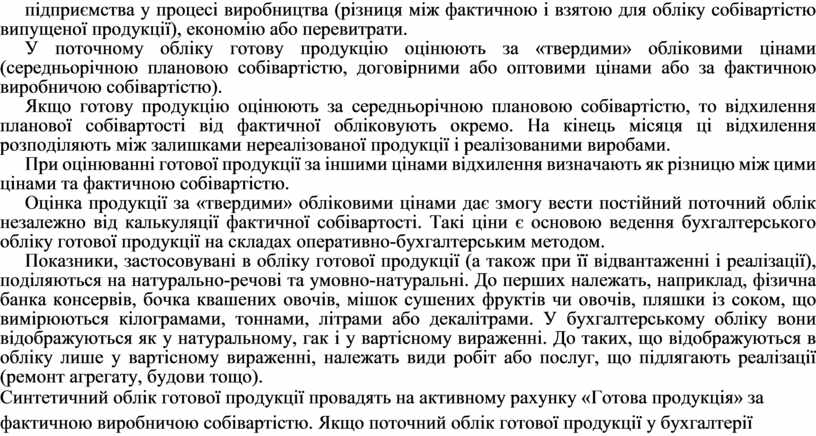 У поточному обліку готову продукцію оцінюють за «твердими» обліковими цінами (середньорічною плановою собівартістю, договірними або оптовими цінами або за фактичною виробничою собівартістю).