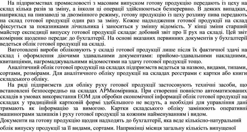 На підприємствах промисловості з масовим випуском готову продукцію передають із цеху на склад кілька разів за зміну, а інколи ці операції здійснюються безперервно. В деяких випадках, наприклад на пивзаводі за двозмінного режиму, готову продукцію із цеху розливу пива передають на склад готової продукції один раз за зміну. Кожне надходження готової продукції на склад фіксується за показниками лічильника і заноситься у змінну відомість. У кінці зміни старший майстер експедиції випуску готової продукції складає добовий звіт про її рух на складі. Цей звіт комірник щоденно передає до бухгалтерії. На основі вказаних первинних документів у бухгалтерії ведеться облік готової продукції на складі.