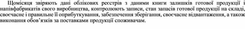 Щомісяця звіряють дані облікових реєстрів з даними книги залишків готової продукції і напівфабрикатів свого виробництва, контролюють записи, стан запасів готової продукції на складі, своєчасне і правильне її оприбуткування, забезпечення зберігання, своєчасне відвантаження, а також виконання обов’язків за поставками продукції споживачам.