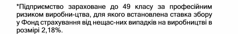 *Підприємство зараховане до 49 класу за професійним ризиком виробни- цтва, для якого встановлена ставка збору у Фонд страхування від нещас- них випадків на виробництві в розмірі 2,18%.