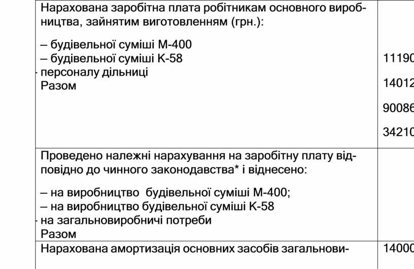 Проведено належні нарахування на заробітну плату від- повідно до чинного законодавства* і віднесено: – на виробництво будівельної суміші М-400; – на виробництво будівельної суміші К-58 – на загальновиробничі потреби Разом |