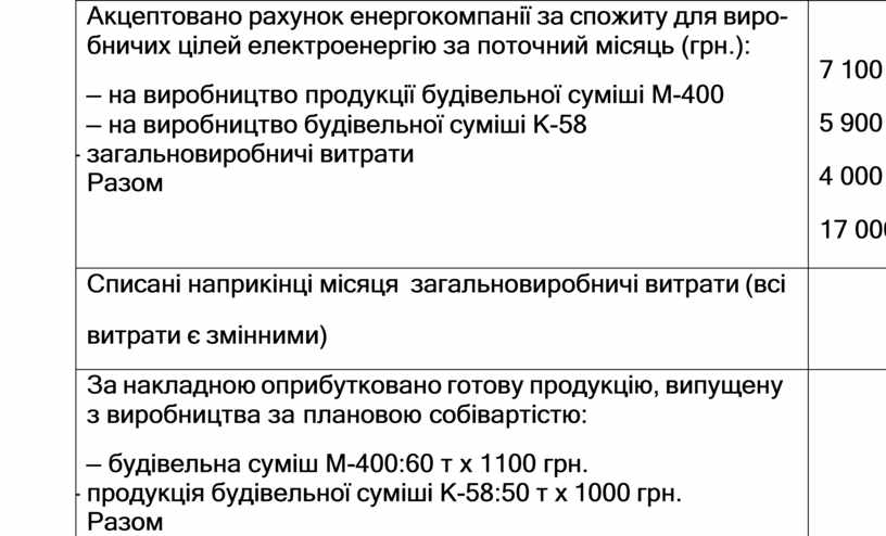 Акцептовано рахунок енергокомпанії за спожиту для виро- бничих цілей електроенергію за поточний місяць (грн.): – на виробництво продукції будівельної суміші М-400 – на виробництво будівельної суміші К-58 – загальновиробничі витрати Разом |