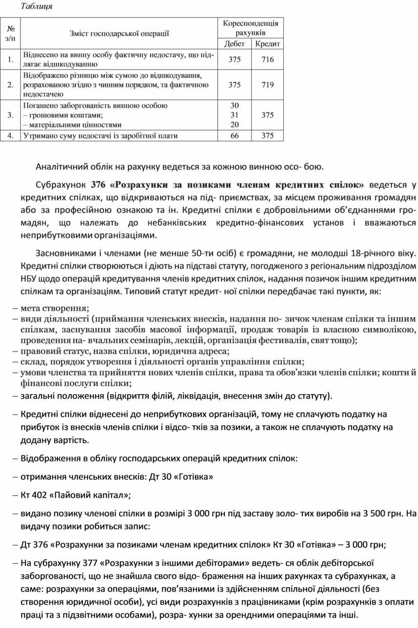 Субрахунок 376 «Розрахунки за позиками членам кредитних спілок» ведеться у кредитних спілках, що відкриваються на під- приємствах, за місцем проживання громадян або за професійною ознакою та ін. Кредитні спілки є добровільними об’єднаннями гро- мадян, що належать до небанківських кредитно-фінансових установ і вважаються неприбутковими організаціями.