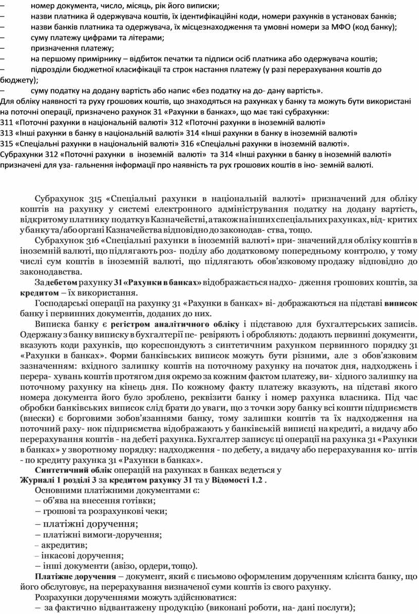Виписка банку є регістром аналітичного обліку і підставою для бухгалтерських записів. Одержану з банку виписку в бухгалтерії пе- ревіряють і обробляють: додають первинні документи, вказують коди рахунків, що кореспондують з синтетичним рахунком первинного порядку 31 «Рахунки в банках». Форми банківських виписок можуть бути різними, але з обов’язковим зазначенням: вхідного залишку коштів на поточному рахунку на початок дня, надходжень і перера- хувань коштів протягом дня окремо за кожним фактом платежу, ви- хідного залишку на поточному рахунку на кінець дня. По кожному факту платежу вказують, на підставі якого номера документа його було зроблено, реквізити банку і номер рахунка власника. Під час обробки банківських виписок слід брати до уваги, що з точки зору банку всі кошти підприємств (внески) є борговими зобов’язаннями банку, тому залишки коштів та їх надходження на поточний раху- нок підприємства відображають у банківській виписці на кредиті, а видачу або перерахування коштів - на дебеті рахунка. Бухгалтер записує ці операції на рахунка 31 «Рахунки в банках» у зворотному порядку: надходження - по дебету, а видачу або перерахування ко- штів - по кредиту рахунка 31 «Рахунки в банках».