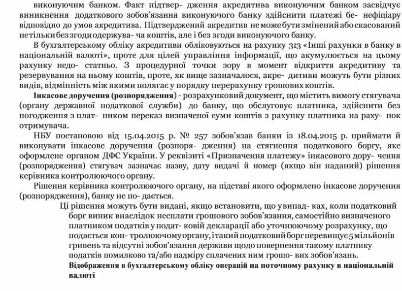 НБУ постановою від 15.04.2015 р. № 257 зобов’язав банки із 18.04.2015 р. приймати й виконувати інкасове доручення (розпоря- дження) на стягнення податкового боргу, яке оформлене органом ДФС України. У реквізиті «Призначення платежу» інкасового дору- чення (розпорядження) стягувач зазначає назву, дату видачі й номер (якщо він наданий) рішення керівника контролюючого органу.