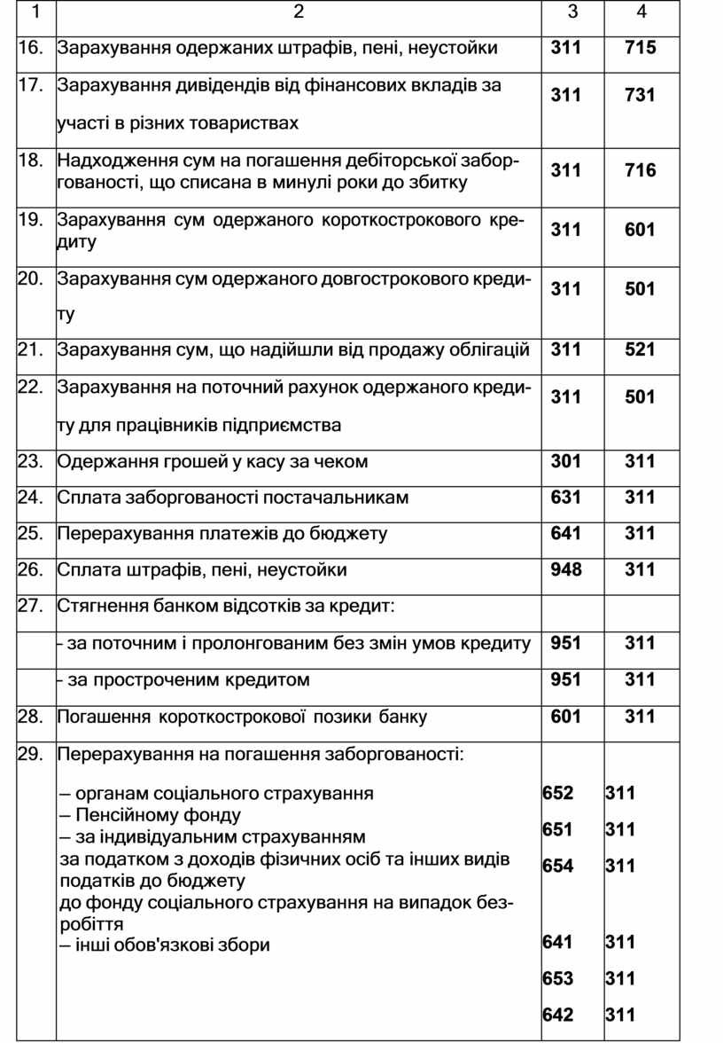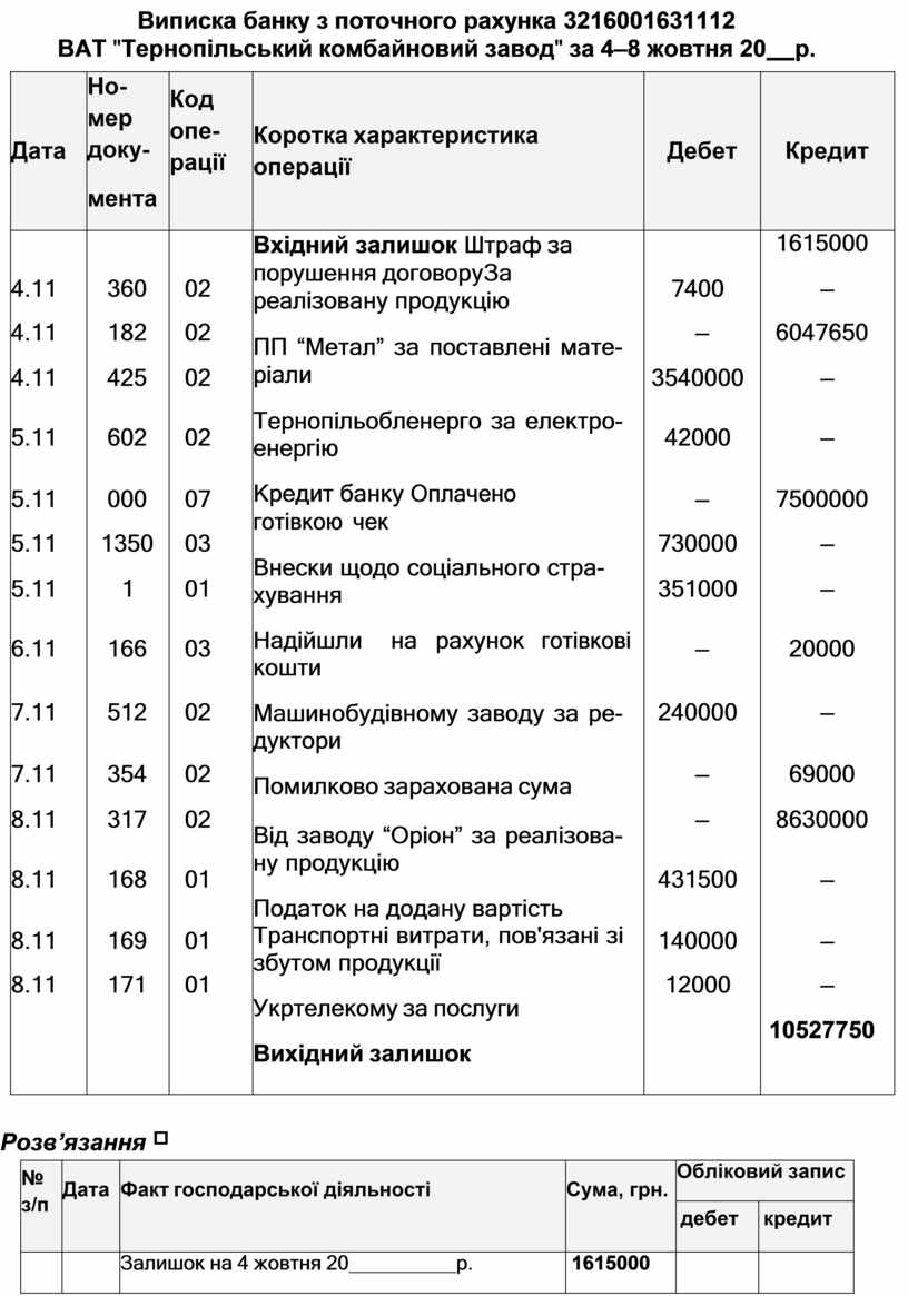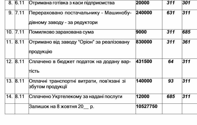 Вхідний залишок Штраф за порушення договору За реалізовану продукцію ПП “Метал” за поставлені мате- ріали Тернопільобленерго за електро- енергію Кредит банку Оплачено готівкою чек Внески щодо соціального стра- хування Надійшли на рахунок готівкові кошти Машинобудівному заводу за ре- дуктори Помилково зарахована сума Від заводу “Оріон” за реалізова- ну продукцію Податок на додану вартість Транспортні витрати, пов'язані зі збутом продукції Укртелекому за послуги Вихідний залишок |