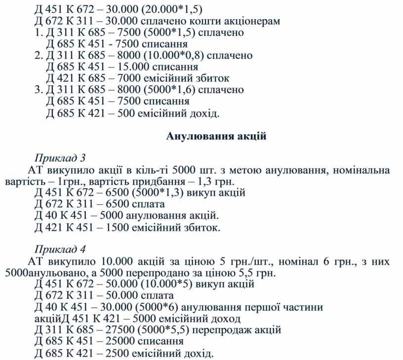 Д 672 К 301,311 – сплата грошових коштів акціонерам при викупі акцій. Перепродаж власних акцій.