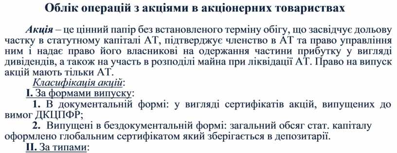 Для визначення типу та категорій акцій необхідно брати до уваги такі