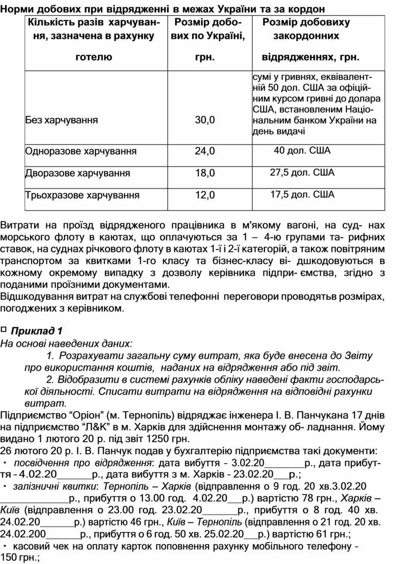 Підприємство “Оріон” (м. Тернопіль) відряджає інженера І. В. Панчука на 17 днів на підприємство “Л&К” в м. Харків для здійснення монтажу об- ладнання. Йому видано 1 лютого 20 р. під звіт 1250 грн.