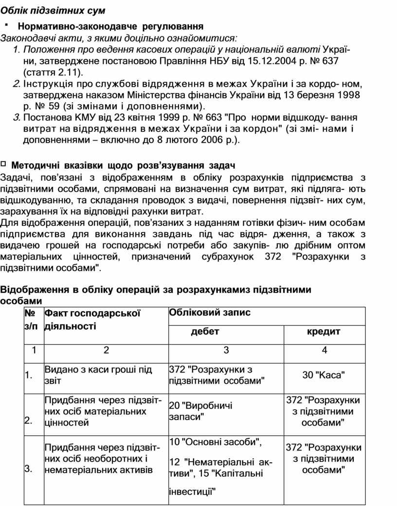 Задачі, пов’язані з відображенням в обліку розрахунків підприємства з підзвітними особами, спрямовані на визначення сум витрат, які підляга- ють відшкодуванню, та складання проводок з видачі, повернення підзвіт- них сум, зарахування їх на відповідні рахунки витрат.