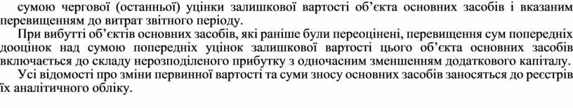 У разі перевищення суми попередніх дооцінок над сумою попередніх уцінок залишкової вартості об’єкта основних засобів при черговій уцінці залишкової вартості цього об’єкта основних засобів спрямовується на зменшення іншого додаткового капіталу із включенням різниці між сумою чергової (останньої) уцінки залишкової вартості об’єкта основних засобів і вказаним перевищенням до витрат звітного періоду.