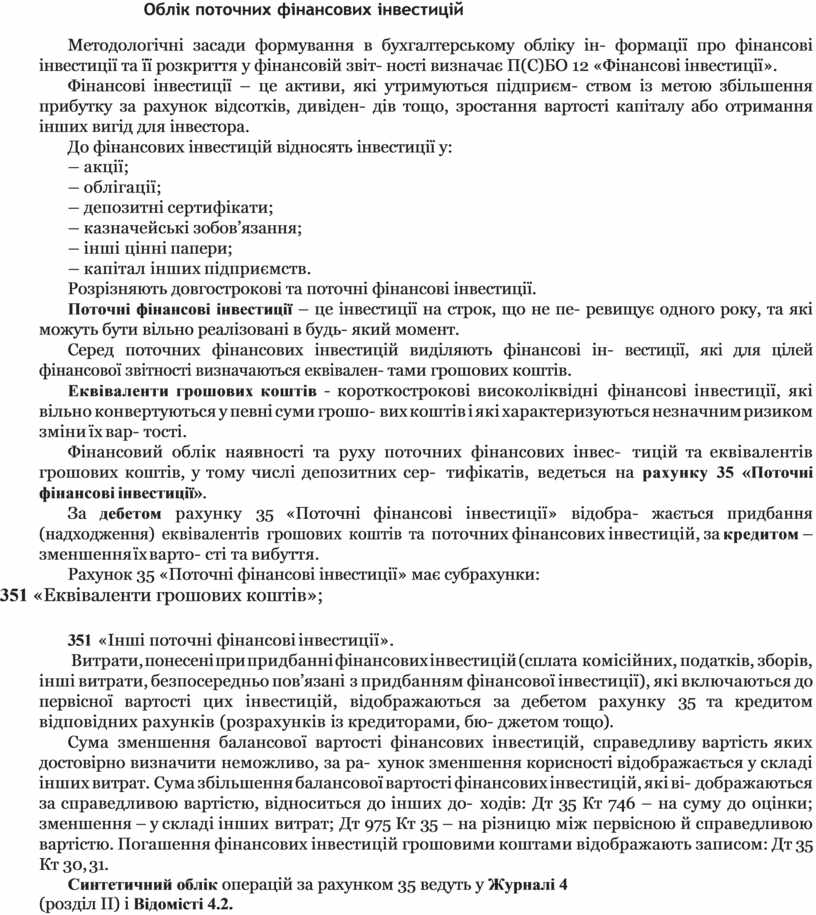За дебетом рахунку 35 «Поточні фінансові інвестиції» відобра- жається придбання (надходження) еквівалентів грошових коштів та поточних фінансових інвестицій, за кредитом – зменшення їх варто- сті та вибуття.