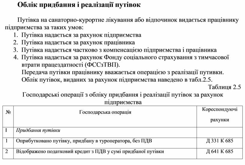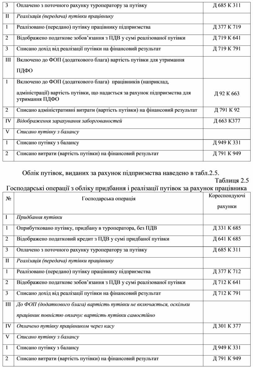 Таблиця 2.5 Господарські операції з обліку придбання і реалізації путівок за рахунок працівника