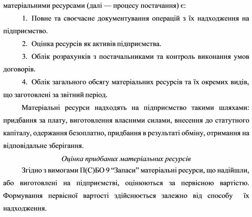Згідно з вимогами П(С)БО 9 “Запаси” матеріальні ресурси, що надійшли, або виготовлені на підприємстві, оцінюються за первісною вартістю. Формування первісної вартості здійснюється залежно від способу їх надходження.