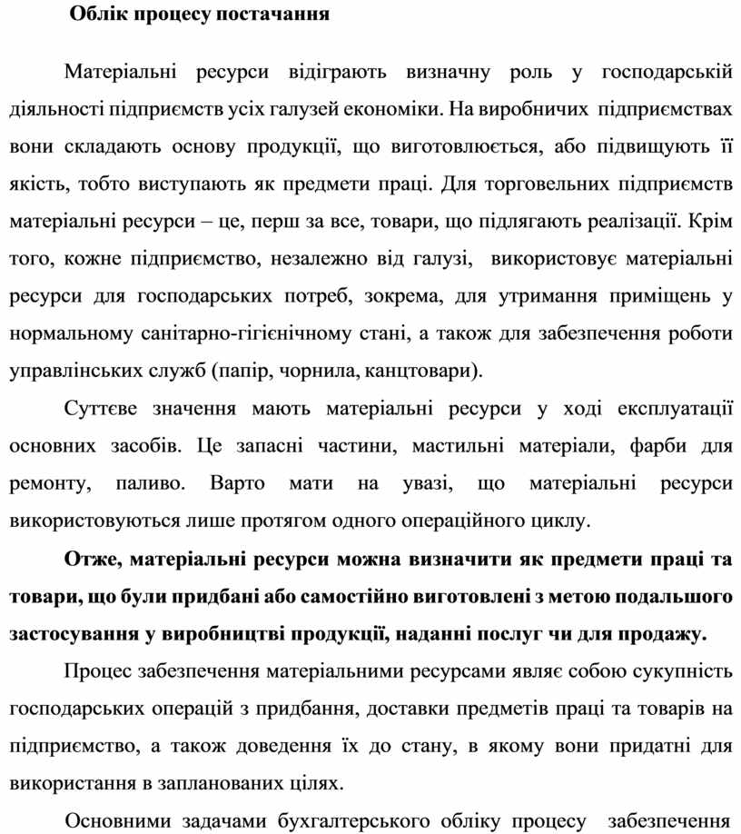 Процес забезпечення матеріальними ресурсами являє собою сукупність господарських операцій з придбання, доставки предметів праці та товарів на підприємство, а також доведення їх до стану, в якому вони придатні для використання в запланованих цілях.