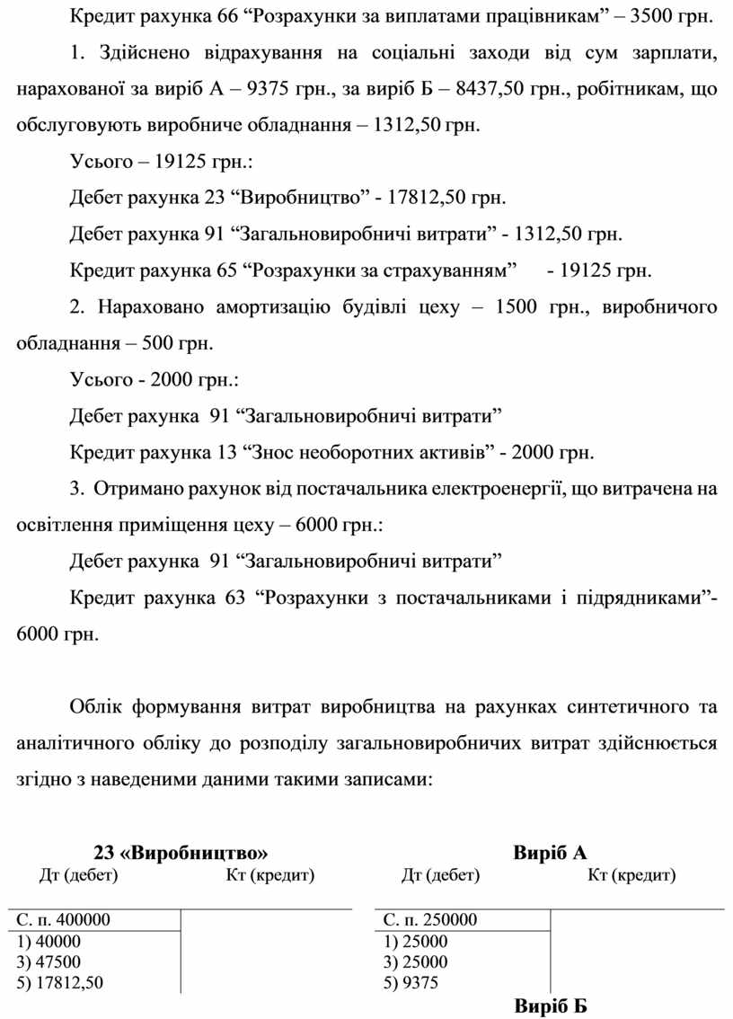 Облік формування витрат виробництва на рахунках синтетичного та аналітичного обліку до розподілу загальновиробничих витрат здійснюється згідно з наведеними даними такими записами: