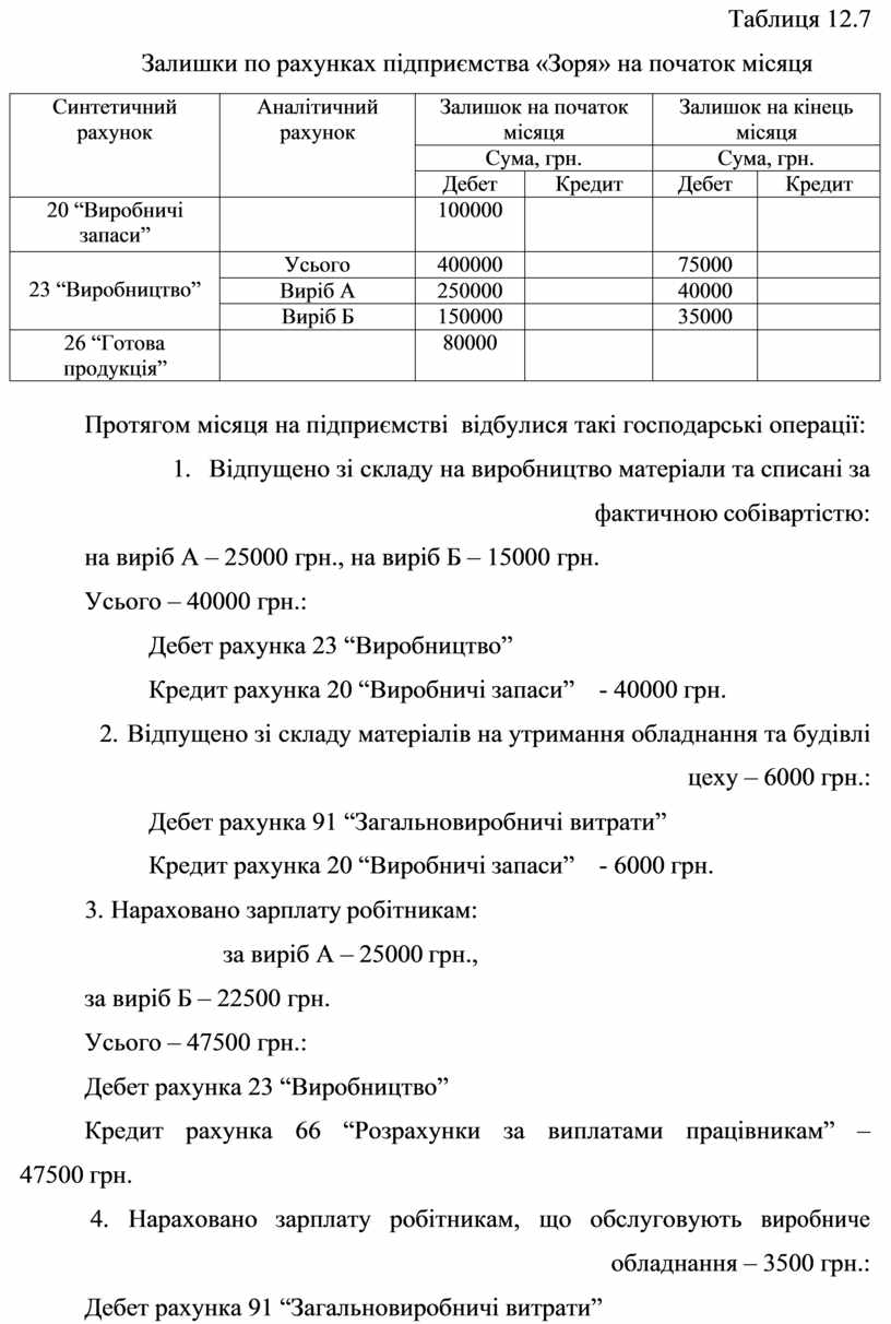 Станом на початок місяця у підприємства «Зоря» є залишки по рахунках синтетичного та аналітичного обліку (табл. 12.7).
