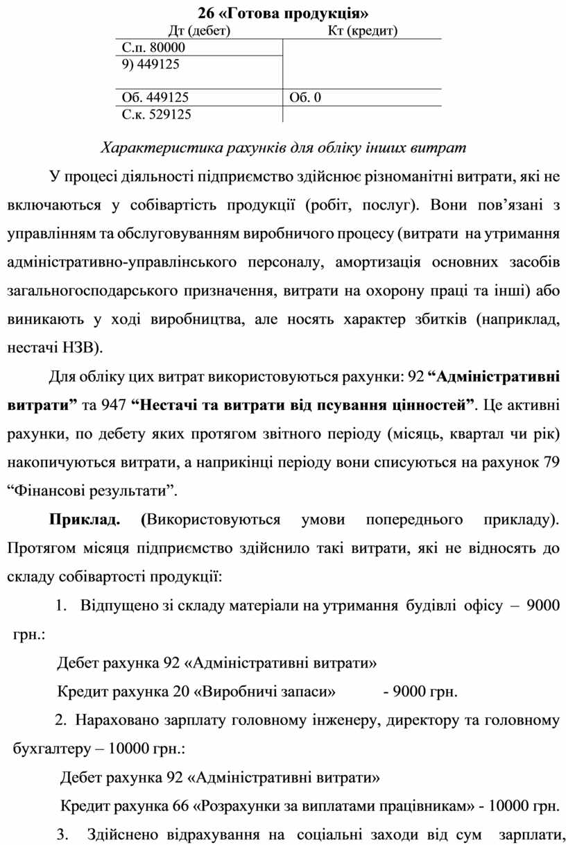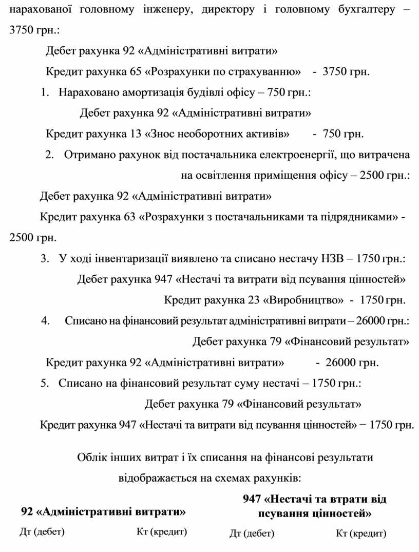 Для обліку цих витрат використовуються рахунки: 92 “Адміністративні витрати” та 947 “Нестачі та витрати від псування цінностей”. Це активні рахунки, по дебету яких протягом звітного періоду (місяць, квартал чи рік) накопичуються витрати, а наприкінці періоду вони списуються на рахунок 79 “Фінансові результати”.